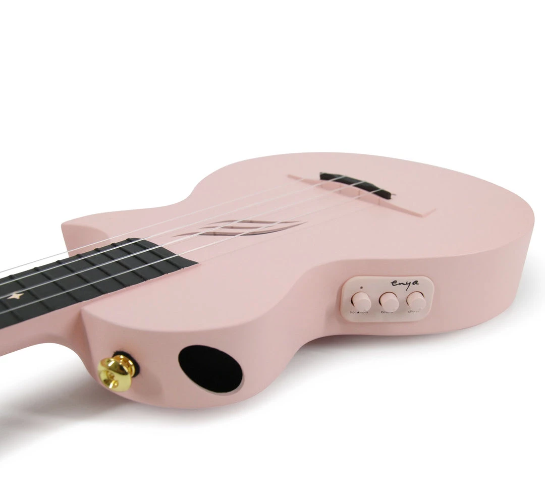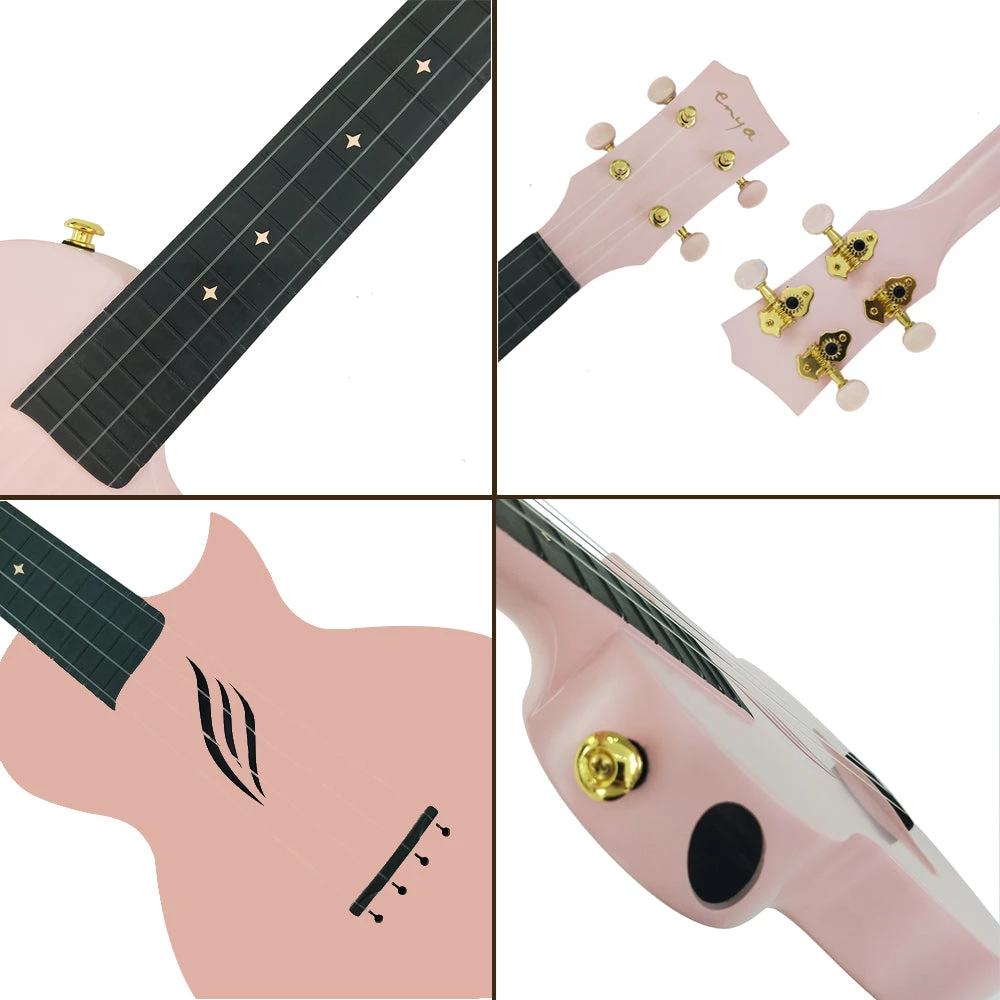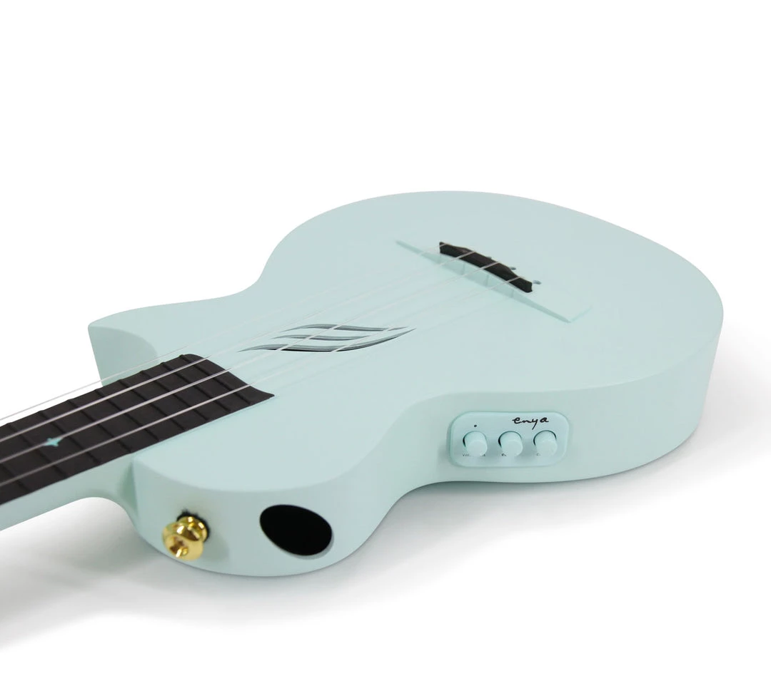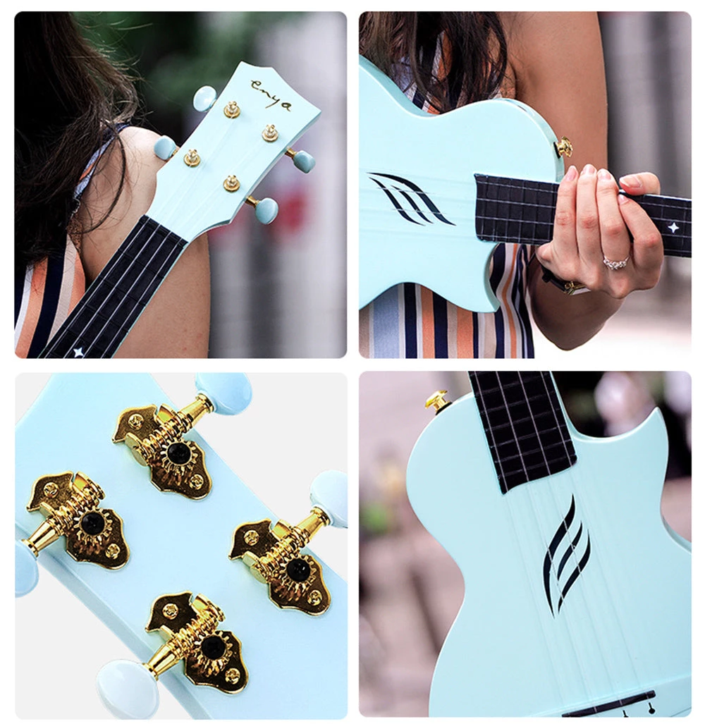 The unique Enya Nova has an eye-popping design and is made of carbon fiber composite. This polycarbonate material will give your ukulele a much brighter sound. The lightweight yet durable construction provides a greater resonance for such a surprisingly thin body! This incredibly resistant material is also waterproof and a breeze to clean. This ukulele is suitable for any level of player who seeks a one-of-a-kind style with the added sonic enhancements of bonded carbon atoms!