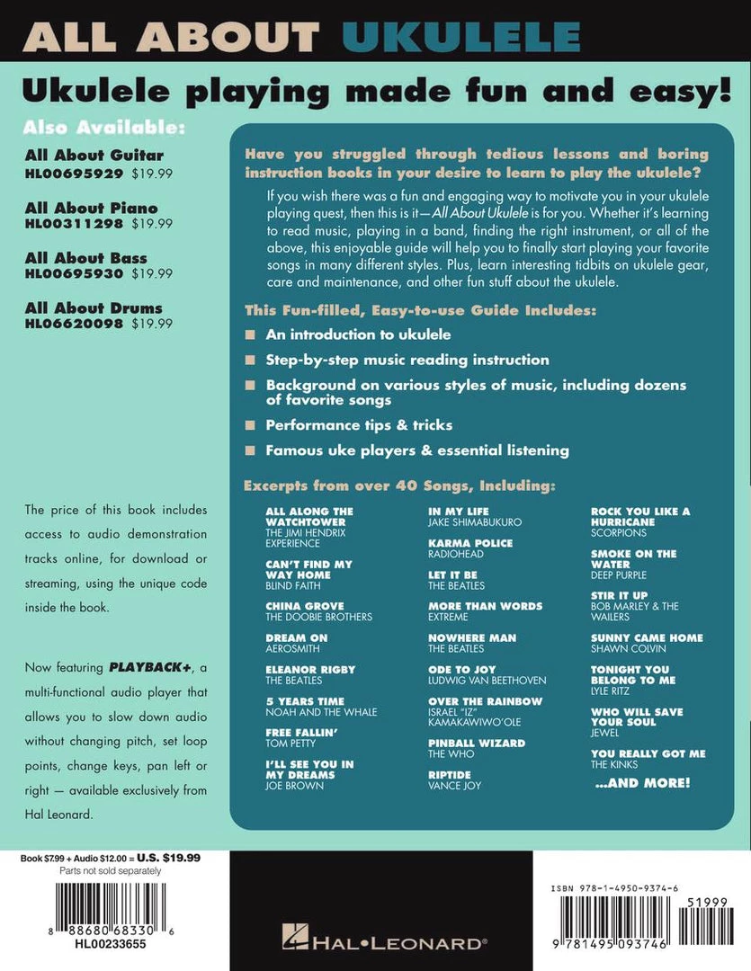 Have you struggled through tedious lessons and boring instruction books in your desire to learn to play the ukulele? If you wish there was a fun and engaging way to motivate you in your uke playing quest, then this is it: All About Ukulele is for you. Whether it’s learning to read music, playing in a band, finding the right instrument, or all of the above, this enjoyable guide will help you to finally start playing your favorite songs in many different styles. Plus, learn interesting tid-bits on ukulele gear, care and maintenance, other fretted instruments, and other fun stuff about the uke. This fun-filled, easy-to-use guide includes: