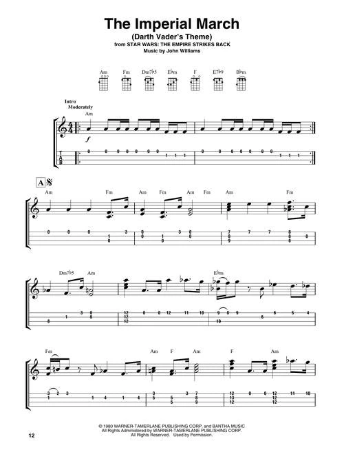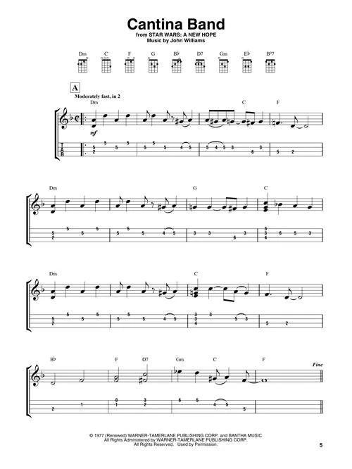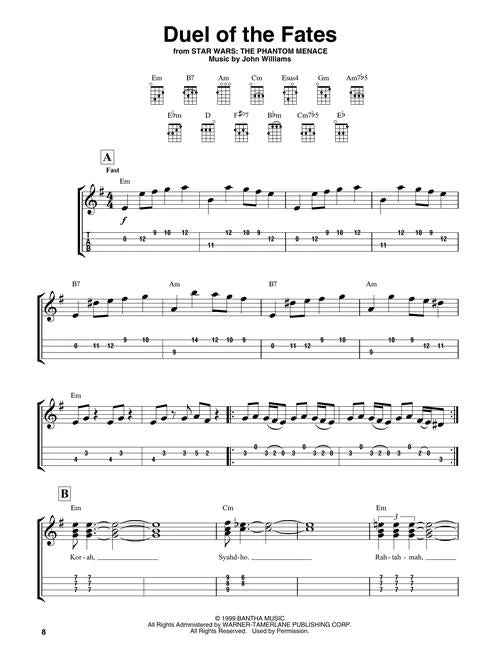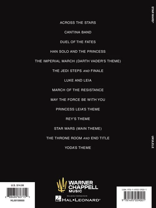 Now you can play John Williams’ masterpieces from the Star Wars franchise on the ukulele in this songbook featuring notes and tab. Songs: Across the Stars • Cantina Band • Duel of the Fates • Han Solo and the Princess • The Imperial March (Darth Vader’s Theme) • The Jedi Steps and Finale • Luke and Leia • March of the Resistance • May the Force Be with You • Princess Leia’s Theme • Rey’s Theme • Star Wars (Main Theme) • The Throne Room (And End Title) • Yoda’s Theme.