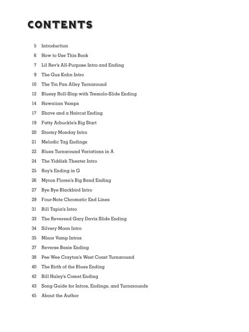 Great songs have four things in common: a strong intro, a powerful ending, a melodic hook or catchy riff, and memorable lyrics. If you’d like to learn how you can spice up your repertoire, let Lil’ Rev show you how a simple intro or ending can really lift a tune up. In this book and video pack, you’ll explore early jazz, blues, rock, folk and old time traditions. Open to anyone who already knows some basic chords and is willing to venture up the neck a little! Includes nearly an hour of video lessons available for download or streaming online, featuring performances by Lil’ Rev.