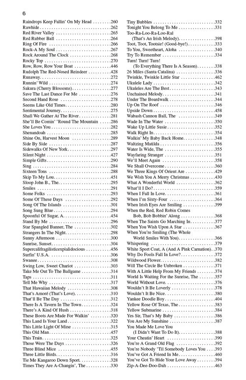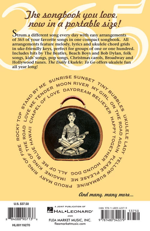 Compiled and arranged by Liz and Jim Beloff, The Daily Ukulele: To Go features 365 well-known songs with easy ukulele arrangements in one 5-1/2 inch x 8-1/2 inch compact songbook. Featuring the same songs and arrangements from the original full-size Daily Ukulele, this streamlined edition is smaller, lighter and perfect for those who want to travel with their favourite songbook. All arrangements feature melody, lyrics and ukulele chord grids in uke-friendly keys and never require a page turn in the middle of a song. Includes hits by the Beatles, Beach Boys and Bob Dylan, folk songs, kids’ songs, pop songs, Christmas carols, and Broadway and Hollywood tunes. A comb binding allows for easy βfold-flatβ usage. The Daily Ukulele: To Go offers ukulele fun all year long!