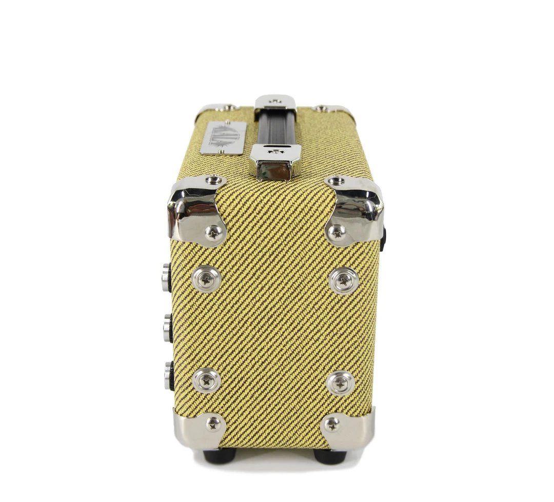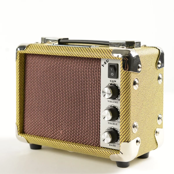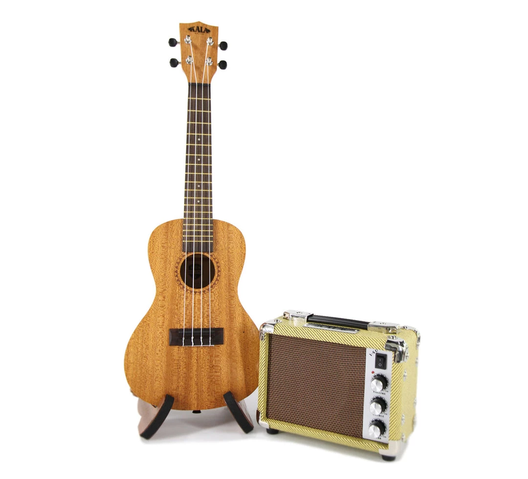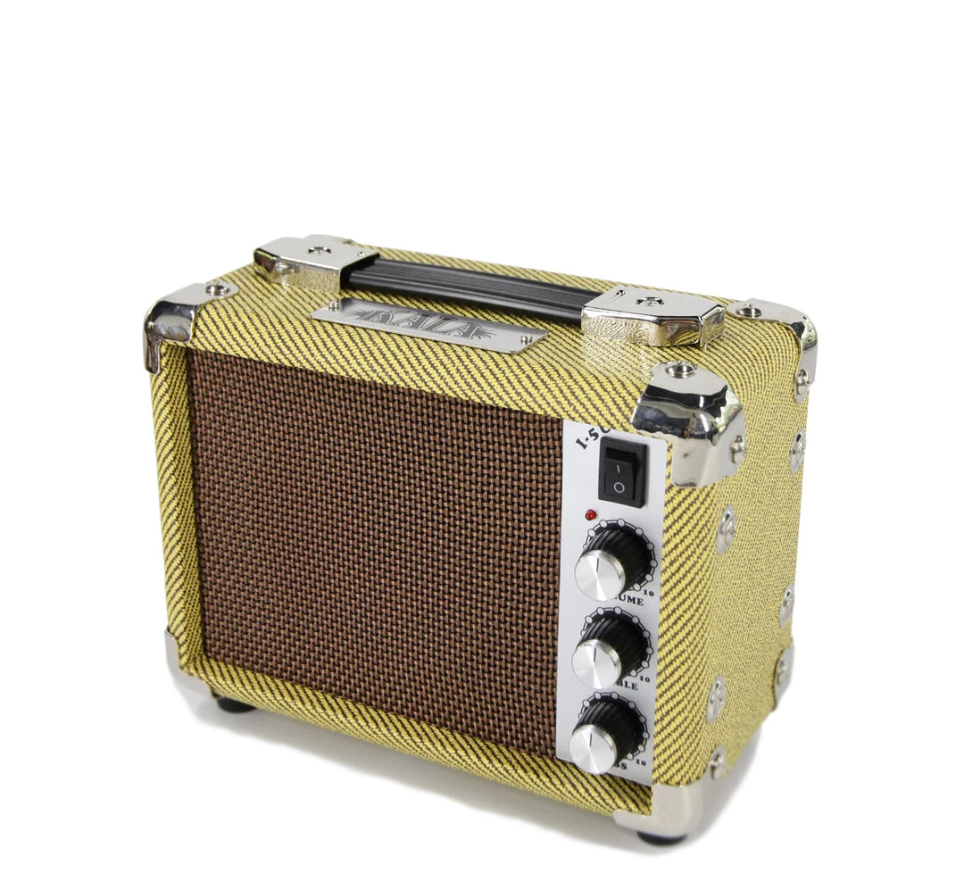 The portable Kala Tweed Amp is great for practice or jamming anywhere. Weighing less than five pounds, take it outside and power it with two 9v batteries or, for indoor sessions, plug into an outlet with the included AC adapter. This five watt amp has a five inch speaker and controls for volume, treble, and bass to dial in the perfect tone. Plug your headphones into the included jack for quiet practice or play along with your favorite songs using the auxiliary input for a phone or MP3 player. Play wherever the music takes you with the Kala Tweed Amp.