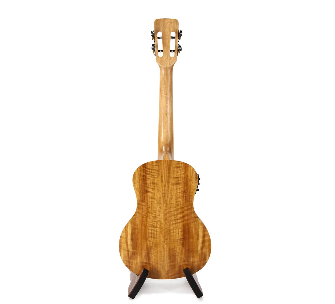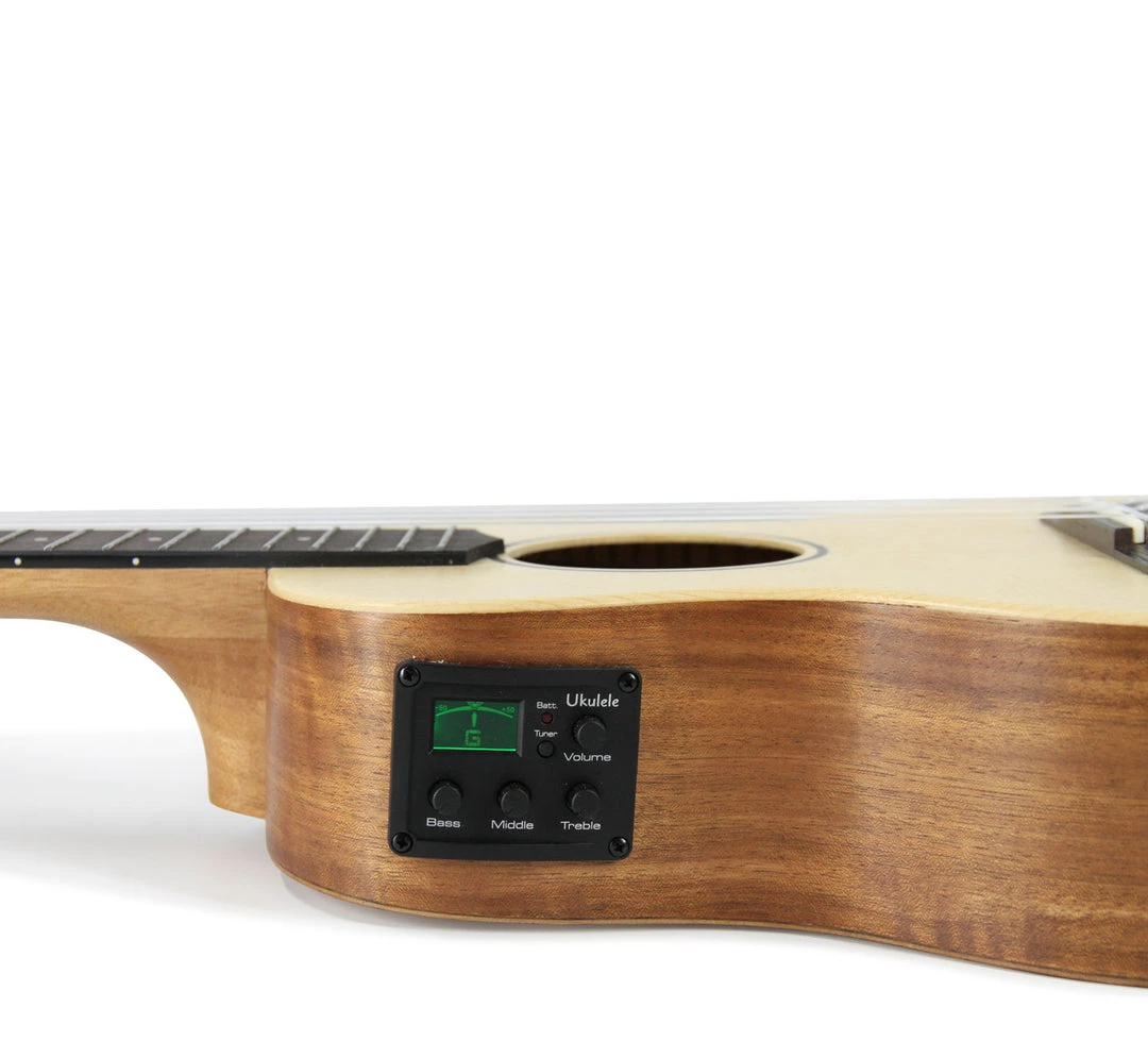 All ukuleles come in 2 versions. With or without pickup. The active pickup (OEM brand) comes complete with an on-board chromatic tuner, 4 controls to adjust the high, mid, bass, and volume. It produces a very natural sound and has sensitive on-board controls – a popular choice amongst players who jam or play with amplification.