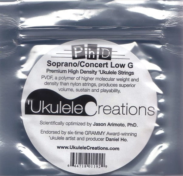 PhD Soprano/Concert Low G is a premium high density ukulele string made from PVDF–a polymer of higher molecular weight and density than nylon strings. It produces superior volume, sustain, and playbility.